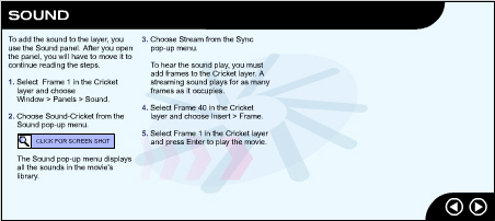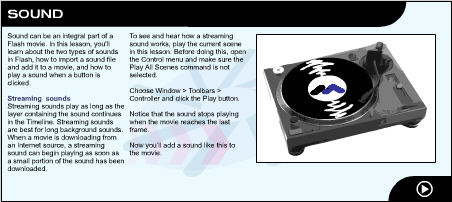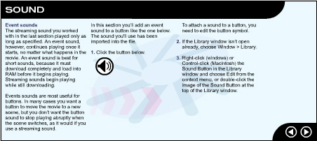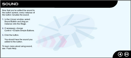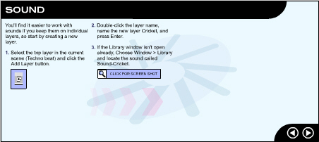 Урок 6. Звук Выберите команду Help (Справка) Þ Lessons (Уроки) Þ 7 Sound (Звук). Вы увидите окно программы Flash, показанное на рис. 1.48. Составной частью фильма может быть звук. В этом уроке вы узнаете о звуках двух типах, которые могут воспроизводиться в программе Flash, об импорте звука и введении его в фильм, а также об "озвучивании" кнопок. ![]() Рис. 1.48. Начальное окно урока, посвященного звуку Потоковый звук Потоковый звук слышится все время, пока на временной диаграмме продолжается воспроизведение содержащего его слоя. Потоковый звук наиболее удобен в качестве фонового. При загрузке фильма из Интернета воспроизведение потокового звука начинается сразу после начальных кадров фильма и продолжается по мере загрузки остальных кадров. Чтобы увидеть и услышать, как функционирует потоковый звук, можно воспроизвести текущую сцену данного урока. Перед этим убедитесь, что в меню Control (Управление) не выбрана команда (т. е. снят флажок рядом с именем команды) Play All Scenes (Воспроизвести все сцены). Выберите команду Controller (Панель воспроизведения) и нажмите кнопку Play (Воспроизвести), Обратите внимание, что воспроизведение звука прекращается на последнем кадре фильма. Теперь посмотрим, как звук вводится в фильмы. Со звуками работать гораздо проще, если каждый из них располагается в собственном слое, потому для начала нужно создать новый слой. 1. На временной диаграмме выделите самый верхний слой в текущей сцене (он называется Techno beat) и нажмите кнопку Add Layer (Добавить слой). 2. Дважды щелкните на имени слоя и введите новое имя Cricket (Сверчок). 3. Выберите команду Window (Окно) Þ Library (Библиотека) и в окне библиотеки найдите звук с именем Cricket (рис. 1.49). 4. Чтобы ввести в слой звук, используется диалоговое окно Frame Properties (Свойства кадра). Если это окно будет загораживать инструкции, просто перетащите его в сторону. ![]() Рис. 1.49. Добавление слоя 5. Выделите первый кадр в слое Cricket и выберите команду Modify (Изменить) Þ Frame (Кадр) или дважды щелкните на кадре. 6. В открывшемся диалоговом окне Frame Properties перейдите па вкладку Sound (Звук). 7. Выберите пункт Cricket в раскрывающемся списке Sound. В этом списке представлены все звуки, имеющиеся в библиотеке текущего фильма. ![]() Рис. 1.50. Добавление звука к слою 8. В раскрывающемся списке Sync (Синхронизация) выберите пункт Stream (Поток) и нажмите кнопку ОК. 9. Выделите 40-й кадр в слое Cricket и выберите команду Modify (Изменить) Þ Frame (Кадр) или дважды щелкните на кадре. 10. Выберите команду Control (Управление) Þ Rewind (Перемотать), а затем - Control (Управление) Þ Play (Воспроизвести) (рис. I.50). Звуки-события Потоковый звук воспроизводится столько, сколько задано в фильме, а запущенный однажды звук-событие воспроизводится полностью независимо от продолжительности фильма. Звуки-события удобны для коротких сигналов, поскольку для воспроизведения такой звук должен быть полностью загружен в оперативную память компьютера (этим он отличается от потокового звука, который воспроизводится по мере загрузки). Звуки-события лучше всего подходят для "озвучивания" кнопок. Причина здесь следующая. В большинстве случаев кнопки добавляются к фильму, чтобы дать пользователю возможность воспроизвести фильм с новой сцены. Если звук, воспроизводимый после щелчка на кнопке, при переключении на новую сцену внезапно прерывается, как было бы при использовании потокового звука, это может смутить пользователя. 1. Щелк