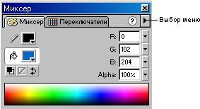 Использование панелей Плавающие панели позволяют просмотреть, организовать и изменить элементы фильма, а также с помощью этих панелей можно изменить свойства выделенных элементов. Панели предлагают настройки для работы с цветами, текстом, трансформами, кадрами, сценами и целыми фильмами. Например, атрибуты текста можно выбрать в панели Character (Знаки), а в панели Frames (Кадры) - создать ярлык для кадра и выбрать настройки кадрирования. Чтобы вызвать полный список доступных во Flash панелей, выполните команду Window (Окно) Þ Panels (Панели). В процессе работы панели можно отобразить или скрыть, сгруппировать и изменить их размеры. С помощью кнопок панели Launcher (Запуск) в нижней части окна приложения можно отобразить или скрыть панели Info (Информация), Mixer (Смеситель), Instance (Трансформа), Frame (Кадр) и Actions (Процедуры). Панель Mixer изображена на рис. 2.13. Можно объединить несколько панелей и сохранить такое расположение для будущей работы или вернуться к отображению панелей по умолчанию (когда панели Info, Mixer, Instance отображаются справа от окна приложения). Большинство панелей содержат всплывающее меню с дополнительными настройками. Всплывающее меню обозначено треугольником в верхнем правом углу панели. (Затененный треугольник означает, что всплывающего меню для этой панели не существует.) ![]() Рис. 2.13. Выбор - дополнительных настроек Чтобы открыть панель, выполните команду Window (Окно) Þ Panels (Панели) и выберите нужную панель из появившегося списка. Чтобы закрыть панель, выполните один из следующих шагов: