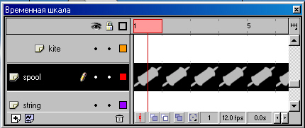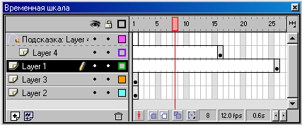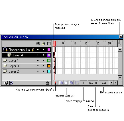 Окно Timeline Окно Timeline (Структура) отображает организацию отдельных слоев и кадров фильма и управляет им во времени. Основные компоненты, которыми вы оперируете в окне Timeline, - слои, кадры и воспроизводящая головка. Слои фильма отображаются в виде списка и левой части окна Timeline. Содержащиеся в каждом слое кадры отображаются во временной диаграмме справа от имени соответствующего слои. В заголовке временной диаграммы (в правой части окна Timeline) выводится количество кадров. В нижней части временной диафаммы виден номер текущего кадра (который указывает воспроизводящая головка и содержание которого отображается на Столе), текущая скорость показа и время воспроизведения фильма от начала и до текущего кадра (рис. 2.15). При просмотре отображается фактическая скорость воспроизведения анимации, которая может отличаться от заданной, если, например, компьютер не может воспроизводить анимацию достаточно быстро.![]() Рис. 2.15. Окно Timeline Можно отображать во временной диаграмме уменьшенные копии каждого кадра. Временная диаграмма показывает, какая именно анимация содержится в фильме - кадрировапная или пошаговая, а также наличие траектории движения. Подробную информацию об анимации см. в гл. 11.Средства управления уровнями в окне Timeline (Структура) позволяют скрывать или показывать содержание слоев, блокировать и разблокировать (запрещать и разрешать для редактирования) или показывать содержание слоя в контурах. См. разд. "Редактирование слоев" гл. 8.Кроме того, во временной диаграмме можно вставлять, удалять, выделять и перемещать отдельные кадры и последовательности кадров в том же или в другом слое. См. разд. "Работа с кадрами во временной диаграмме" этой мины.Изменение представления окна Timeline По умолчанию окно Timeline расположено над Столом в верхней части основного окна приложения. Чтобы изменить его позицию, следует пристыковать окно Timeline к нижней или боковой границе основного окна приложения или вынести в отдельное окно. Также можно скрыть окно Timeline или изменить его размер, чтобы сделать видимыми все слои и кадры. Если все слои фильма не видны одновременно, то их рекомендуется просматривать с помощью ползунка прокрутки, появляющегося посередине окна Timeline, или увеличить размер окна, переместив его нижнюю границу. Вот как можно выполнить другие действия с окном Timeline.