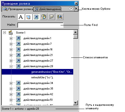 Проводник предлагает список, представляющий содержание фильма, в иерархическом порядке. Проводник можно настроить таким образом, чтобы в нем отображались определенные категории элементов фильма - текст, графика, кнопки, фрагменты фильмов, действия, импортированные файлы и объекты Macromedia Generator. Выбранные категории можно отображать как элементы фильма (сцены), символы или и так и так. Можно расширить и, наоборот, сузить иерархическое дерево. Проводник фильма имеет всплывающее меню настроек и предлагает контекстное меню, содержащее настройки и действия, допустимые для выделенных в настоящий момент элементов или для самого Проводника фильма. Всплывающее меню настроек обозначено треугольником в верхнем правом углу Проводника. Проводник фильмов вызывается командой Window (Окно) Þ Movie Explorer (Проводник фильмов).
