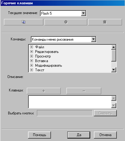 2. Выберите но всплывающем меню Command (Команды) пункты Drawing Menu Commands (Команды меню рисования). Drawing Tools (Инструменты рисования) или Test Movie Menu Commands (Команды меню тестирования фильма), чтобы просмотреть набор горячих клавиш для выбранной категории. 3. В списке Commands (Команды) выполните команду, для которой хотите создать или изменить горячую клавишу. Описание выбранной команды появляется в диалоговом окне в области Description (Описание). 4. Воспользуйтесь одним из следующих способов; Чтобы ввести комбинацию клавиш, просто нажмите клавиши на клавиатуре.