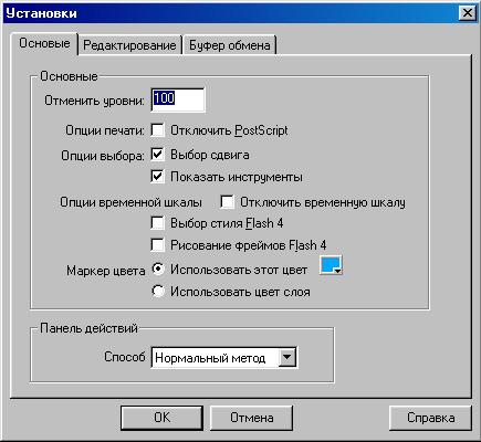 Параметры Flash Во Flash можно задавать параметры для наиболее часто выполняемых действий. Можно редактировать действия и буфер отката. Чтобы задать параметры Flash, выполните команду Edit (Правка) Þ Preferences (Параметры). См. разд. "Выбор настроек рисования " гл. 3.Чтобы задать параметры, выполните команду Edit (Правка) Þ Preferences (Параметры), перейдите на одну из вкладок: General (Общие), Editing (Редактирование) или Clipboard (Буфер) и выберите необходимые настройки. Установка основных параметров (вкладка General):