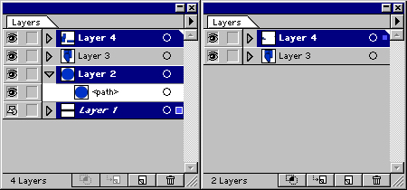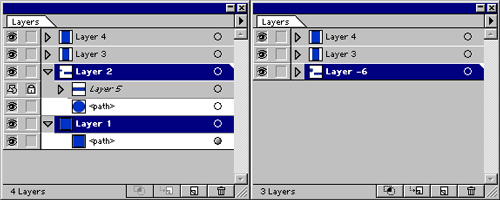 Скопировать слой можно и путем перетаскивания строки слоя на кнопки Create New Layer (Создать новый слой) ( Уменьшить количество слоев можно за счет слияния тех из них, которые могут образовать единое целое. Для слияния двух или более выделенных слоев требуется выполнить команду Merge Selected (Объединить выделенные слои) меню палитры. Содержимое всех объединяемых слоев перемещается на активный слой или в активную группу. Желательно, чтобы активный слой или группа не были фиксированы или не были "спрятаны", поскольку программа будет "вынуждена" переместить все объекты на один из доступных слоев или в одну из доступных групп. В приведенном на рис. 10.6 примере программой выполнено слияние не на активный слой Layer 2, а на слой Layer 4, т. к. Layer 2 фиксирован, слой Layer 1 спрятан и фиксирован, а слой Layer 4 является единственным доступным.