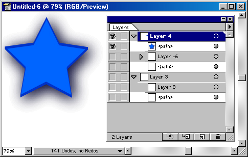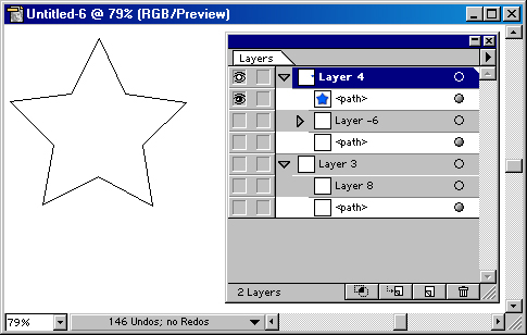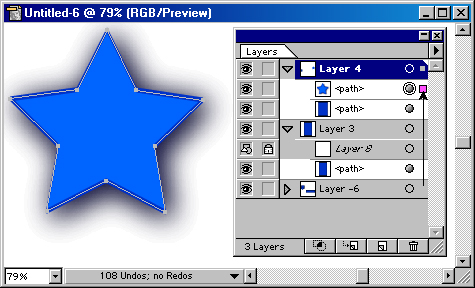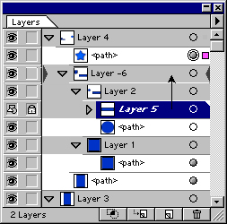 Перемещать объекты можно и с помощью палитры Layers (Слои). При выделении на слое каких-либо объектов в строке слоя в палитре с именем этого слоя или группы появляется квадратик, совпадающий по цвету с условным "цветом" слоя. Перемещение этого квадратика на новую строку