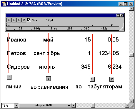 Затем следует щелкнуть на кнопке Alignment (Выравнивание по началу текста), которая обеспечит совмещение начала линейки палитры и левого края текстового блока для горизонтального текста или верхнего края текстового блока для вертикального текста. Если длина палитры окажется короче текстового блока, то можно растянуть палитру, потянув за квадратик в нижнем правом углу палитры. Установка флажка Snap (Выровнять) обеспечивает при перемещении табуляторов "притягивание" их к меткам линейки. Для временного отключения этой функции достаточно нажать клавишу [Ctrl]. Табулятор создается щелчком над линейкой. Его позиция относительно левого края текстового блока в горизонтальном тексте или относительно верхнего края в вертикальном тексте отображается в поле Х (справа от флажка).