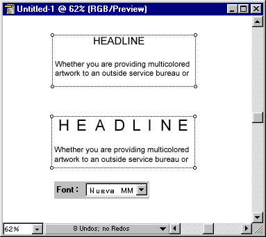 При использовании шрифта формата Adobe Multiple Master предоста&дя^т-ся возможность автоматически изменить параметры шрифта (насыщенность и межбуквенные пробелы) таким образом, чтобы заголовок заполнил ширину полосы набора (рис. 11.48). Если используется обычный шрифт, то изменяются только межбуквенные пробелы (рис. 11.49). Для этого необходимо выделить соответствующий фрагмент и вытэлмии» команду Fit Headline (Подгонка заголовка) меню Тyре (Текст).