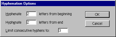 В первых двух полях устанавливается минимальное количество букв, которое допускается в начале и в конце переносимого слова, другими словами, размер минимального слога, который допускается при переносах. Правила хорошей верстки не допускают бесконечных лесенок из дефисов в правой части колонки, поэтому в поле Limit consecutive hyphens (Допустимое число переносов) можно определить максимальное количество переносов в соседних строках. По умолчанию принято значение в 3 строки, а возможный диапазон составляет от 1 строки до 127 строк. Конкретное значение может быть определено с учетом качества документа, ширины колонки, особенностей языка и т. д. Если в тексте встречается слово, отсутствующее в словаре програямы, особенно если оно находится в непосредственной близости к зоне перемоса то можно вручную установить мягкие (discretionary hyphen — дискреционные переносы, дословно "предоставленные на усмотрение") переносы. В программе Adobe Illustrator этот перенос имеет наивысший приоритет, таким образом можно исправить неверный "машинный перенос". Для установки дискреционного переноса необходимо установить курсор инструмента Type (Текст) в месте возможного переноса и нажать комбинацию клавиш [Ctrl]+[Shift]+[-].
