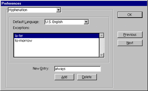 В окне Exceptions (Исключения) диалогового окна PreJisreaces {Установки) приводится список слов с указанными переносами. Если слово, которое может иметь перенос, введено без дефисов, то это означает, что переносы данного слова запрещены. Для того чтобы добавить в список исключений новое слово, его необходимо ввести в поле New Entry (Новый вход), а затем нажать кнопку Add (добавить). Для удаления слова из списка его нужно выделить и нажать кнопку Delete (Удалить).