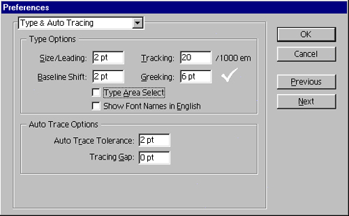 Известно, что технология WYSIWYG (What You See Is What You Get — "Что видите (на экране), то и получите (на оттиске)") предназначена для обеспечения максимально возможного соответствия у изображения, которое будет получено при распечатке, тому, которое отображается на экране. На это расходуются значительные вычислительные ресурсы, поэтому мелкий шрифт во многих программах отображается условными прямоугольниками, образующими длинную серую полоску строки. При общем обзоре (уменьшении) страницы шрифт также отображается условно — серыми плашками. Такой прием называется в английской терминологии Greek Type ("греческий шрифт", т. е. "непонятный"). Для установки величины кегля, ниже которого шрифт отображается условно, требуется открыть раздел Type & Auto Tracing (Шрифт и автотрассировка) диалогового окна Preferences (Установки). В поле Greeking (Показывать текст плашками менее) (рис. 11.52) по умолчанию установлено значение б пунктов.