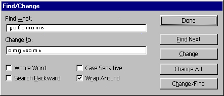Текст для поиска вводится в поле Find what (Найти), а если требуется замена, то в поле Change to (Заменить на) вводится текст для замены. При этом можно менять параметры поиска и замены, если использовать в различных сочетаниях четыре флажка диалогового окна.