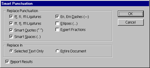 Полиграфические знаки пунктуации Клавиатура унаследовала почти все ограничения пишущей машинки, с ее помощью нельзя ввести типографские кавычки (тем более, что в разных странах они разные), "правильное" длинное тире и многое другое. Эти знаки, как правило, имеются в шрифтовом файле, но ввести их можно с помощью набора цифрового кода, который, во-первых, надо помнить, а во-вторых, это как минимум пять нажатий клавиш. Поэтому во многих программах предусмотрена функция замены знаков, вводимых с клавиатуры, на знаки, требующиеся для полиграфического документа, например, замену машинописных кавычек на "лапки" и т. д. Команда Smart Punctuation (Типографская пунктуация) меню Type (Текст) выводит на экран одноименное диалоговое окно (рис. 11.58), в котором представлены замены машинописных (клавиатурных) знаков на полиграфические.