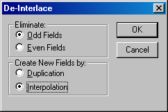 Установка переключателя Eliminate (Удалить) в положениея Odd Fields (Нечетные строки) или в положение Even Fields (Четные строки) обеспечивает удаление соответствующих строк. При помощи переключателя Create New Fields by (Добавить новые строки с помощью) можно выбрать один из двух способов добавления новых строк: Dublication (Дублирования) или Interpolation (Интерполяции).