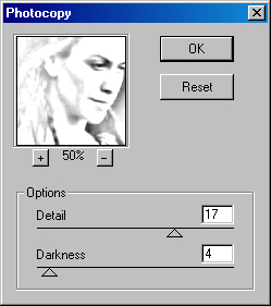 Фильтр Photocopy Фильтр Photocopy (Ксерокопия) служит для создания изображения, имитирующего оттиск на типичном дубликаторе (например, ксероксе или других подобных устройствах) с характерными особенностями (неоднородность заливки, резкие контуры и пр.).
