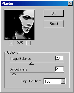 Фильтр Plaster (Гипс) используется для имитации плоских рельефов, получаемых из гипса или алебастра (рис. 12.51). Цветовая гамма'строится из черного, оттенков серого и белого цветов. Для большей реалистичности слепка следует выбрать в качестве основного и фонового цветов только светло-серые и белые цвета. Поле Image Balance (Тоновой баланс) служит для определения пропорций светлой и темной площадей рельефа в диапазоне от 0 до 50. Меньшие значения соответствуют преобладанию светлых областей, а большие ~ темных областей. Детальность изображения определяется в поле Smoothness (Смягчение) в диапазоне от 1 (максимальная) до 15 (минимальная). В раскрывающемся списке Light Position (Свет) выбирается направление источника освещения рельефа: