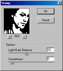 Фильтр Stamp (Линогравюра) позволяет преобразовать изображение, имитирующее художественную технику линогравюры — гравюры на линолеуме (рис. 12.53). Значение в поле Light/Dark Balance (Тоновой баланс) определяет пороговый уровень распределения белых и черных областей в диапазоне от 0 до 50.