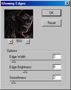 В поле Edge Brightness (Яркость) в диапазоне от 0 до 20 устанавливают уровень "свечения" красок линейного рисунка, а в поле Smoothness (Смягчение) в диапазоне от 1 до 15 — степень их сглаженности.