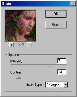 Фильтр Grain (Зерно) позволяет преобразовать изображение в совокупность крупных цветовых зерен, которые в целом создают впечатление оттиска цветной литографии (рис. 12.58). Значение в поле Intensity (Интенсивность) опреддойг величину зерна в диапазоне от 0 до 100. В поле Contrast (Контраст) в диапазоне от 0 до 100 Устанавливается уровень различия между цветами зерен. В раскрывающемся списке Grain Тyре (Зерно) можно выбрать один из типов зерна: