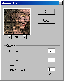 Фильтр Mosaic Tiles (Мозаичные фрагменты) предназначен для имитации изображения в виде мозаики из изразцовых элементов (рис. 12.59). Значение в поле Tile Size (Размер фрагментов) определяет величину изразцов в диапазоне от 2 до 100, а в поле Grout Width (Величина зазоров) в диапазоне от 1 до 15 — величину промежутков между ними. Уровень освещенности промежутков устанавливается в поле Lighten Grout (Яркость зазоров) в диапазоне от 0 до 10.