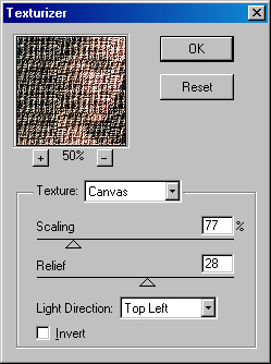 Масштаб текстуры определяется в поле Scaling (Масштаб) в диапазоне от 50 до 200%. Поле Relief (Рельеф) определяет толщину текстуры в диапазоне от 0 до 50.