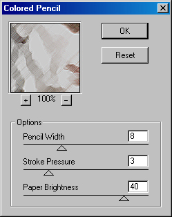 Поле Stroke Pressure (Нажим) в диапазоне от 0 до 15 устанавливает силу действия карандаша, а поле Paper Brightness (Яркость бумаги) в диапазоне от 0 до 50 — уровень "просвечивания" бумаги сквозь слой штрихов карандашей.