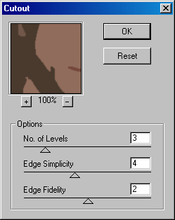 Фильтр Cutout Фильтр Cutout (Аппликация) предназначен для имитации графической техники создания рисунка из вырезанных фрагментов разноцветных материалов (бумаги, ткани и пр.). Техника очень близкая по духу к векторной графике. Поэтому изображение после применения такого фильтра идеально для выполнения последующей трассировки (особенно при небольших значениях числа уровней и максимальном значении "простоты краев"). В поле No. of Levels (Число уровней) диалогового окна (рис. 12-4) устанавливается количество цветовых уровней в диапазоне от 2 до 8. Поле Edge Simplicity (Простота краев) в диапазоне от 0 до 10 определяет степень обобщенности контура элемента аппликации: чем выше значение, тем лаконичнее (или "грубее", кому как нравится) контур.