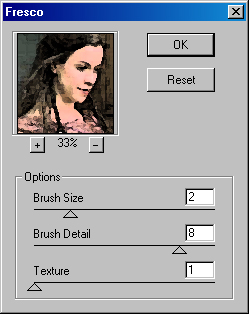 Фильтр Fresco (Фреска) предназначен для весьма отдаленной имитации живописной техники по сырой штукатурке — фрески (рис. 12.7). Значение в поле Brush Size (Размер кисти) определяет размер мазка кисти в диапазоне от 0 до 10. Поле Brush Detail (Детализация) служит для установки точности передачи изображения в диапазоне от 1 до 10 (чем меньше значение, тем точнее сохраняется исходный рисунок).