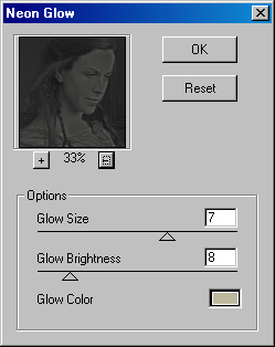 Фильтр Neon Glow Фильтр Neon Glow (Неоновый свет) предназначен для создания изображения в неоновых цветах, например, для имитации Изображения наружной рекламы, использующей неоновые светильники (рис. 12-8). Значение в поле Glow Size (Область) в диапазоне от -24 до +24 определяет величину области неонового цвета в зависимости от тонового уровня.