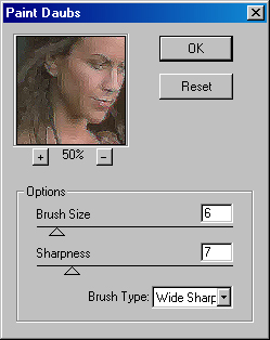 Значение в поле BrusTi Sjze (Размер кисти) определяет размер кисти в диапазоне от 1 до 50, что влияет на степень обобщенности результирующего изображения. Своеобразный стиль масляной живописи заметен именно при больших значениях. В поле Sharpness (Резкость) в диапазоне от 0 до 40 устанавливается уровень жесткости краев кисти, а также степень слияния соседних мазков друг с другом. В раскрывающемся списке Brush Type (Кисть) можно выбрать один из типов кисти: