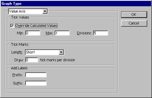 Если диаграмма представляет собой не декоративное пятно на странице издания, а требуется для работы и анализа, то совершенно необходимо, чтобы метки на оси значений давали возможности однозначно "считывать" цифровую информацию. Кроме того, эти метки могут быть снабжены указанием единицы измерения, например, "$" или "Mb". Метки на оси (Tick Marks) ~- это черточки или линии, перпендикулярные оси значений и расположенные в соответствующих точках, отображающих единицы измерения. О том, как изменить параметры меток на оси, если одна диаграмма является комбинацией нескольких типов, смотрите ниже в разделе "Комбинированные диаграммы" данной главы. В списке в верхней части диалогового окна Graph Type (Тип диаграммы) следует выбрать вариант Value Axis (Ось значений), который открывает новый раздел этого диалогового окна (рис. 13.17).