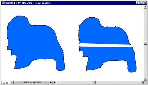 Программа не разбивает "длинные" контуры, имеющие параметры обводки, составные контуры и маски. Для разделения контура следует использовать инструмент Scissors (Ножницы) (?<). Для разбиения составного контура или маски надо сначала выполнить команду Release (Отменить) меню Object/Compound Paths (Объект/Составной контур), а затем воспользоваться инструментом Scissors (Ножницы). Для разбиения маски надо сначала выполнить команду Release (Отменить) меню Object/Mask (Объект/Маска), а затем также воспользоваться инструментом Scissors (Ножницы). Если объект имеет толщину обводки и заливку, то образуется два объекта: один для контура, который не разбивается, и второй для заливки, который разбивается.