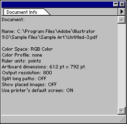 Информация о документе Документ, созданный в программе Adobe Illustrator, зачастую необходимо передавать другим специалистам для продолжения работы над графикой или выполнения заключительных операций (цветоделения, вывода на фотонаборные автоматы). В связи с этим возникает потребность в суммировании информации о документе: шрифты, цветовые параметры, градиентные растяжки, импортированная графика и т. д. Такую информацию можно получить и при желании сохранить и использовать независимо от графического файла, причем информация может отражать данные по отдельному объекту, в этом случае его необходимо выделить и активизировать команду Selection Only (Только выделенные объекты) меню диалогового окна, или по всему документу, в данном случае не должно быть выделенных объектов, а команда Selection Only (Только выделенные объекты) неактивна. В меню File (Файл) представлена команда Document Info (Информация о документе), которая позволяет получить информацию о многих составляющих документа и при необходимости сохранить ее. В списке меню диалогового окна Document Info (Информация о документе) можно выбрать следующие варианты: