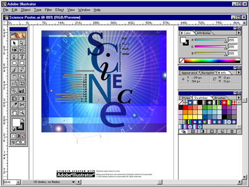 Интерфейс и его элементы После загрузки программы и представления фирменной заставки на экране предстает окно программы, которое принято называть интерфейсом пользователя (User interface). Интерфейс является посредником между человеком и компьютером, он предоставляет все необходимое для работы: инструменты, палитры, диалоговые окна и т. д. Всем этим арсеналом средств необходимо грамотно владеть для того, чтобы быстро и эффективно выполнять разнообразные творческие задачи. Операционная среда Windows 98/2000 имеет сквозной принцип организации всех приложений, работающих под ее управлением, — оконный интерфейс. Все обшив элементы окон выполнены по единому стандарту. Общие элементы интерфейса пользователя Интерфейс пользователя (рис. 2.7) включает заголовок, главное командное меню, рабочие окна для отображения документов, а также совокупность различных палитр, при помощи которых осуществляется редактирование изображений. Заголовок окна программы Самая верхняя полоса темно-синего цвета — строка заголовка - отображает название и значок программы, в данном случае Adobe Illustrator, а также содержит три кнопки, которые позволяют управлять размерами и местоположением программного окна.