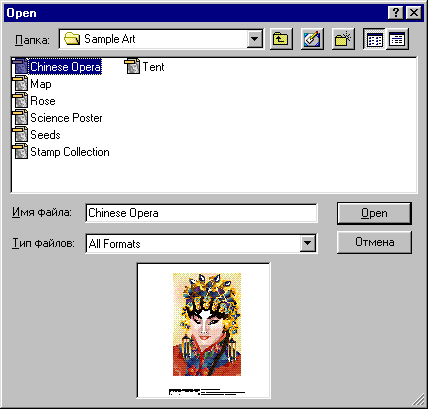 Open (Открыть) меню File (Файл). На экран выводится одноименное диалоговое окно, которое ничем не отличается от обычного окна операционной среды Windows за исключением окна просмотра, расположенного в нижней части диалогового окна. В окне просмотра отображается внешний вид страницы документа, который сохраняется вместе с документом в виде небольшого точечного изображения (рис. 2.25).