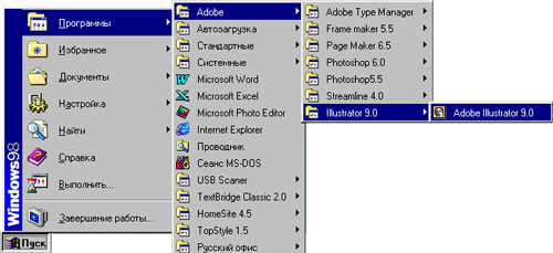 Операционная среда Windows 98/2000 предлагает несколько способов запуска программ, каждый из которых можно использовать в зависимости от ситуации и собственных привычек. После запуска программы на экран выводится интерфейс программы, служащий "пультом управления" программой и предоставляющий все возможности редактирования документа. Способы запуска программы Adobe Illustrator После успешной инсталляции программы самым доступным способом ее запуска является запуск с помощью главного меню операционной системы Windows. В дальнейшем можно обеспечить условия для запуска программы другими способами. Запуск программы из главного меню операционной системы Windows После инсталляции программы Adobe Illustrator необходимо открыть главное меню операционной системы Windows 98/2000, нажав кнопку Пуск (Start) в нижней части экрана. Затем, последовательно перемещая указатель мыши по раскрывающимся подменю, выделить команду Adobe Illustrator 9.0 и щелкнуть кнопкой мыши. Как правило, команда запуска программы Adobe Illustrator 9.0 расположена в группе Adobe (рис. 2.1).