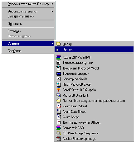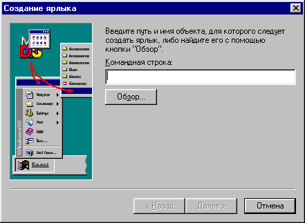 Запуск программы с помощью ярлыка на рабочем стол В операционной среде Windows 98/2000 используется метафора "рабочего стола", на котором могут располагаться компьютерные документы и программы, отображаемые специальными значками — ярлыками. Первоначально на этом "столе" расположены только стандартные значки — My Computer (Мой компьютер). Network Neighborhood (Сетевое окружение), Recycle Bin (Корзина) и некоторые другие в зависимости от выбранных компонентов при установке операционной системы. На "рабочем столе" очень удобно располагать постоянно используемые программы или документы, для того чтобы запускать их без обращения к главному меню Windows, т. е. достаточно быстро. Для размещения программы на рабочем столе необходимо создать ярлык программы. Один из способов указан ниже. Для создания ярлыка необходимо щелкнуть правой кнопкой мыши на свободном месте рабочего стола, вызвав тем самым контекстное меню рабочего стола (рис. 2.2). В контекстном меню следует выбрать команду Создать (Create), а в открывшемся подменю — команду Ярлык (Shortcut). В результате открывается диалоговое окно Создание ярлыка (Create Shortcut) (рис. 2.3).