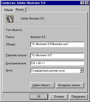 В поле Командная строка (Command line) нужно ввести путь и название программы или нажать кнопку Обзор (Browse) и в одноименном диалоговом окне открыть папку, в которой содержится файл Illustrator.exe. Этот файл необходимо выделить и нажать кнопку Открыть (Open), а затем в диалоговом окне Создание ярлыка (Create Shortcut) нажать кнопку Далее (Next). В открывшемся диалоговом окне Выбор названия программы (Select a name for the shortcut) следует ввести текст, который будет размещен под ярлыком на рабочем столе (подпись ярлыка), например, "Adobe Illustrator 9.0". Щелчок на кнопке Готово (Finish) завершает процедуру создания ярлыка на рабочем столе. Теперь для быстрого запуска программы достаточно дважды щелкнуть ярлык программы. Запуск программы с помощью клавиатуры Операционная система Windows 98/2000 позволяет каждой программе поставить в соответствие комбинацию клавиш, которая дает возможность загрузить программу, не обращаясь к меню. Для присвоения такой комбинации клавиш в качестве одного из простых способов можно порекомендовать следующий. Необходимо выделить ярлык программы на рабочем столе и нажать правую кнопку мыши. В появившемся контекстном меню выбрать команду Свойства (Properties). В открывшемся одноименном диалоговом окне перейти на вкладку Ярлык (Shortcut) (рис. 2.4).