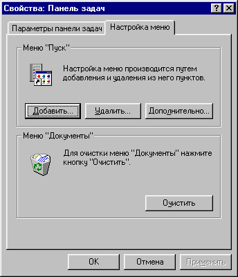 В этом случае ярлык программы должен быть помещен в специальную папку Автозагрузка (Startup). Для этого надо выполнить следующие действия: 1. Открыть главное меню нажатием кнопки Пуск (Start). 2. Выполнить команду Настройка (Settings), а затем команду. Панель задач (Taskbar). 3. В открывшемся диалоговом окне Свойства: Панель задач (Taskbar Properties) выбрать вкладку Настройка меню (Start Menu Programs) (рис. 2.5).