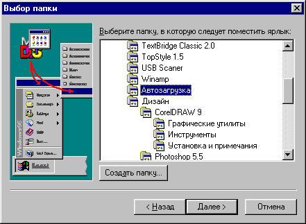 4. Нажать кнопку Добавить (Add). 5. В открывшемся диалоговом окне Создание ярлыка (Create Shortcut) ввести путь к программе или, нажав кнопку Обзор (Browse), найти и выделить исполняемый файл программы. 6. В диалоговом окне Создание ярлыка (Create Shortcut) нажать кнопку Далее (Next). В результате открывается диалоговое окно Выбор папки (Select Program Folder) (рис. 2.6), в котором в списке папок главного меню следует выбрать папку Автозагрузка (Startup) и нажать кнопку Далее (Next). Затем в открывшемся диалоговом окне Выбор названия программы (Select a name for the shortcut) необходимо ввести название программы, например, "Adobe Illustrator 9.0". Щелчок на кнопке Готово (Finish) завершает процедуру включения ярлыка программы в папку автоматической загрузки. Теперь всякий раз после загрузки операционной системы Windows 98/2000 будет загружаться и программа Adobe Illustrator. Более подробно о всех прочих тонкостях загрузки и отображения программы можно узнать из указанной выше литературы, посвященной операционным системам Microsoft Windows 98/2000.