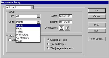 Установка единиц измерения В программе Adobe Illustrator линейки могут отображать деления различных единиц измерения в зависимости от потребности и привычек пользователя. По умолчанию единицей измерения устанавливается пункт (point). Для изменения единицы измерения следует обратиться к команде Preferences (Установки) и выбрать раздел Units & Undo (Единицы измерения и отмена команд). Чтобы установить единицы измерения можно также использовать команду Document Setup (Параметры документа) меню File (Файл), которая выводит на экран одноименное диалоговое окно (рис. 3.11). Программа Adobe Illustrator поддерживает следующие единицы измерения: