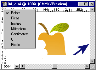 Различие между установкой единиц измерения в диалоговых окнах Preferences (Установки) и Document Setup (Параметры документа) заключается в том, что в первом случае установки относятся к программе, а во втором — к конкретному документу. Выбрать единицу измерения можно из списка, который открывается при щелчке правой кнопкой мыши в области пересечения двух линеек (рис. 3.12).