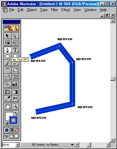 Рисование прямолинейных сегментов Простейшим графическим элементом является прямая линия, построить которую достаточно легко, используя инструмент Pen (Перо) ( Для этого необходимо включить инструмент, подвести курсор к начальной точке и щелкнуть левой кнопкой мыши. На месте щелчка появляется заполненный квадратик, отображающий первую опорную точку сегмента, которая является активной до создания следующей точки. Затем необходимо переместить курсор на новое место, где должна располагаться следующая точка, и снова щелкнуть левой кнопкой мыши. Две точки соединяются прямой линией. Если нужна линия с углом наклона, кратным 45 градусам, следует удерживать клавишу [Shift]. Таким образом, щелкая в нужных местах, можно получить произвольный многоугольник с прямыми сегментами (рис. 5.11).