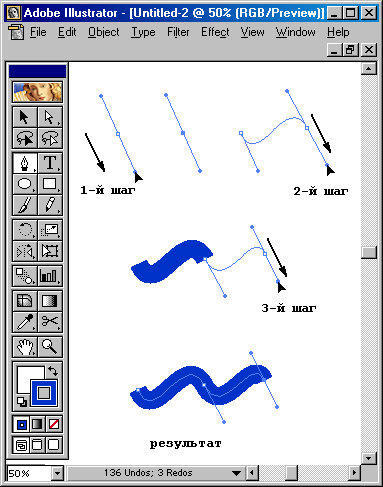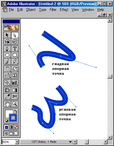 При перемещении управляющей линии ("рычага"), относящейся к гладкой опорной точке, изменяются обе кривые. А при перемещении управляющей линии, относящейся к угловой опорной точке, изменяется только кривая расположенная с той же стороны. Рисование криволинейных сегментов С помощью инструмента Pen (Перо) ( Так же получают следующие опорные точки и определяют кривизну линий (рис. 5.13). Впрочем, поправить (отредактировать) линию можно в любой последующий момент после завершения рисования (поэтому вначале бывает достаточно набросать пpодходящее количество опорных точек для "замышляемого" контура). По умолчанию новая опорная точка создается гладкой.