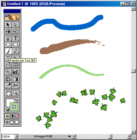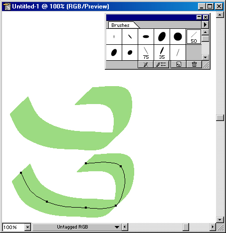 Инструмент Paintbrush Инструмент Paintbrush (Кисть) более характерен для редакторов точечной графики, например, для программы Adobe Photoshop. Тем не менее и векторная программа Adobe Illustrator предлагает инструмент, имитирующий в определенной степени особенности рисования кистью. При включении инструмента в палитре инструментов курсор приобретает форму кисти. После прекращения рисования штриха программа преобразует его в векторный объект (рис. 5.45), который может редактироваться уже средствами векторной графики, а именно инструментами группы Pen (Перо). Более того, любому уже созданному контуру могут быть присвоены параметры кисти, что значительно расширяет художественные возможности программы.