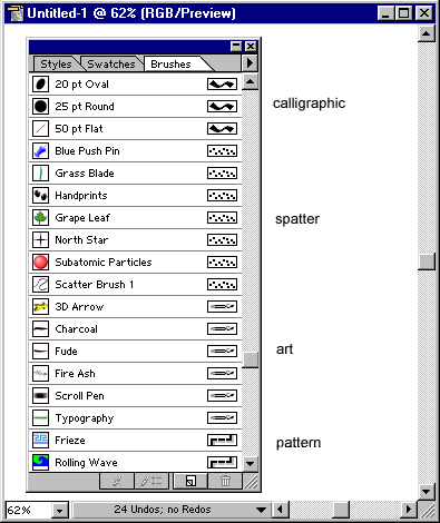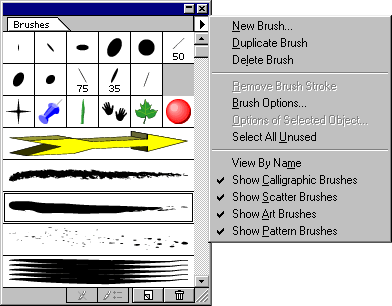 Типы кистей В данной версии программы Adobe Illustrator инструмент Paintbrush (Кисть) значительно усовершенствован. В палитре Brushes (Кисти) (рис. 5.46), которая вызывается на экран командой Show Brushes (Показать кисти) меню Window (Окно), можно выбрать четыре типа кистей.