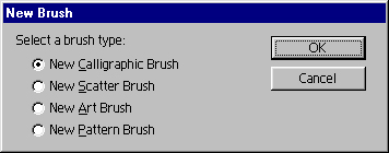 Если требуется изменить достаточно быстро некоторые параметры кисти, то этого можно добиться перенесением рисунка из палитры Brushes (Кисти) на "рабочий стол". После соответствующей обработки видоизмененный образец кисти возвращается обратно в палитру. Для этого необходимо выделить в палитре Brushes (Кисти) нужную кисть, переместить ее на свободное пространство "рабочего стола", выполнить преобразование, например, масштабирование или более существенное изменение рисунка (рисунок кисти — это обычный векторный объект), а затем снова перенести его в палитру. При этом на экран выводится диалоговое окно New Brush (Новая кисть) (рис. 5.51), в котором необходимо указать тип помещаемой кисти.