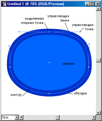 Программа Adobe Illustrator предлагает разнообразные средства для создания векторных изображений — от тончайших перьевых штрихов до имитации мазков кисти. Вместе с тем специфика векторной графики весьма далека от рисования "вручную". Поэтому необходимо представлять себе, как создать векторный контур и как его редактировать (добавлять и удалять опорные точки, изменять форму и т. д.). Контуры и опорные точки Контур (path) — это линия, создаваемая с помощью рисующих инструменов программы и представляющая собой проволочную оболочку объекта. Контуру могут быть затем присвоены параметры обводки (stroke) и заливки (fill) (рис. 5.1). Обычно контур состоит из нескольких сегментов, представляющих собой элементарные кривые Безье и соединенных в опорных точках (anchor points), или узлах. При перемещении одной опорной точки сегменты, связанные с нею, меняют свою форму. Изменить форму сегмента можно также перемещением управляющей точки (control point), связанной с опорной точкой посредством управляющей линии (control line). Контур считается открытым, если начальная и конечная точки не замкнуты, и закрытым, когда начальная и конечная точки сливаются в одну точку. У замкнутого контура теряется смысл начала и конца (хотя это не так для программы, которая в своей основе содержит стандарты языка PostScript, однозначно трактующего начальную и конечную точку в связи с необходимостью определить направление для управления заливкой в составных контурах). При заливке открытого контура программа проводит воображаемую прямую линию, соединяющую начальную и конечную точки, и заполняет его как закрытый контур (рис. 5.2).