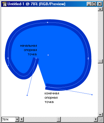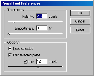 Установка флажка Keep selected (Оставить выделенным) обеспечивает автоматическое выделение контура после его создания. Нарисованную незамкнутую линию можно продолжить. Для этого ее следует выделить, затем подвести курсор к одной из конечных точек и, нажав кнопку мыши, провести линию дальше. Возможность эта становится доступной, если установить флажок Edit selected paths (Редактировать выделенные контуры) и определить расстояние в диапазоне от 2 до 20 пикселов.