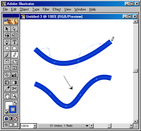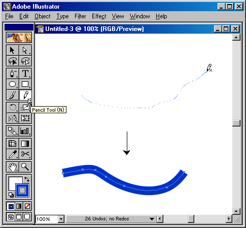 При рисовании этим инструментом используются текущие значения толщины и цвета обводки. Включив инструмент, следует подвести курсор к начальной точке, нажать кнопку мыши и начать рисовать, при этом траектория отмечается точечной линией (рис. 5.6). Если требуется замкнуть контур, то следует нажать клавишу [Alt] (белая зершина карандаша, там где в реальном карандаше располагается иногда ластик, станет черного цвета, а рядом с курсором появится маленький кружок), затем отпустить кнопку мыши и только после этого клавишу. В момент рисования контура, его можно присоединить к уже имеющемуся, если при приближении к его конечной точке нажать клавишу [Ctrl].