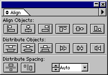 Если кнопки нижнего ряда отсутствуют, следует выполнить команду Show Options (Показать дополнительные поля) меню палитры, которая открывается щелчком на треугольной стрелке в верхней части палитры. Для выравнивания объектов принята следующая логика: