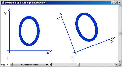 По умолчанию при открытии нового документа оси Х и Y располагаются параллельно горизонтальной и вертикальной сторонам экрана (рабочего листа). Оси можно при необходимости повернуть на любой угол, если ввести соответствующее значение в диалоговом окне Preferences (Установки). Вращение осей может потребоваться, если все элементы (в том числе еще не созданные) должны располагаться под одинаковым углом (эта возможность пригодится тем дизайнерам, которые не мыслят себе оформления страницы без расположения элементов под углом в такой степени, что многие заказчики считают дизайном все, что "поперек страницы"). После вращения осей на определенный угол все помещаемые на странице объекты располагаются под этим углом (рис. 6.7).